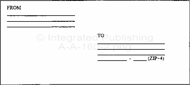 2.1.3 Marking. Unless otherwise specified, each shipping sack shall be marked with the following: “FROM” in characters not less than 4.8 mm (3/16”) high shall be printed in the upper left hand corner of the shipping sack. Immediately after “FROM”, three horizontal lines shall be printed. Each line shall be 114 mm + 3.2 mm (4-1/2” + 1/8”) long. Lines shall be spaced not less than 12.7 mm (1/2”) apart. Approximately centered on the front of the sack, in characters not less than 4.8 mm (3/16”) high, “TO” shall be printed. Immediately after “TO”, four horizontal lines, spaced not less than 12.7 mm (1/2”) apart shall be printed. The first three lines shall be in 114 mm + 3.2 mm (4-1/2” + 1/8”) long and the fourth line shall be 76.2 mm + 3.2 mm (3” + 1/8”) long with a 6.4 mm + 0.06 mm (1/4” + 1/16) gap beginning 50.8 mm + 0.06 mm (2” + 1/6”) from the left edge. A hyphen shall be printed in the gap. After the gap, the line shall continue an additional 19.1 mm + 0.06 mm (3/4”+ 1/16”). Finally, at the end of the fourth line, “(ZIP + 4)”, shall be printed in characters not less than 4.8 mm (3/16”) high. See below illustration reference.