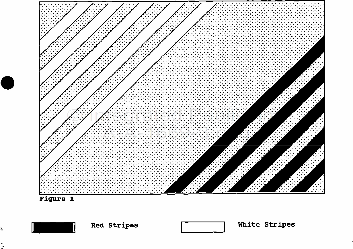 1. The identifying marking for Class 1 bags shall be a pattern consisting of 5 parallel white stripes, each 1/4 + 1/16 inches wide, spaced 1/4 + 1/16 inches apart, a blank space 2-1/4 + 114 inches wide, then 5 parallel red stripes, each 1/4 + 1/16 Inches wide, spaced 1/4 + 1/16 inches apart, finally a blank space 2-1/4 + 1/4 inches wide. This pattern shall be printed over the entire face, back, and gussets of the bag at an angle of 45 k 5 degrees to the overall height dimension of the bag (see Figure 1).